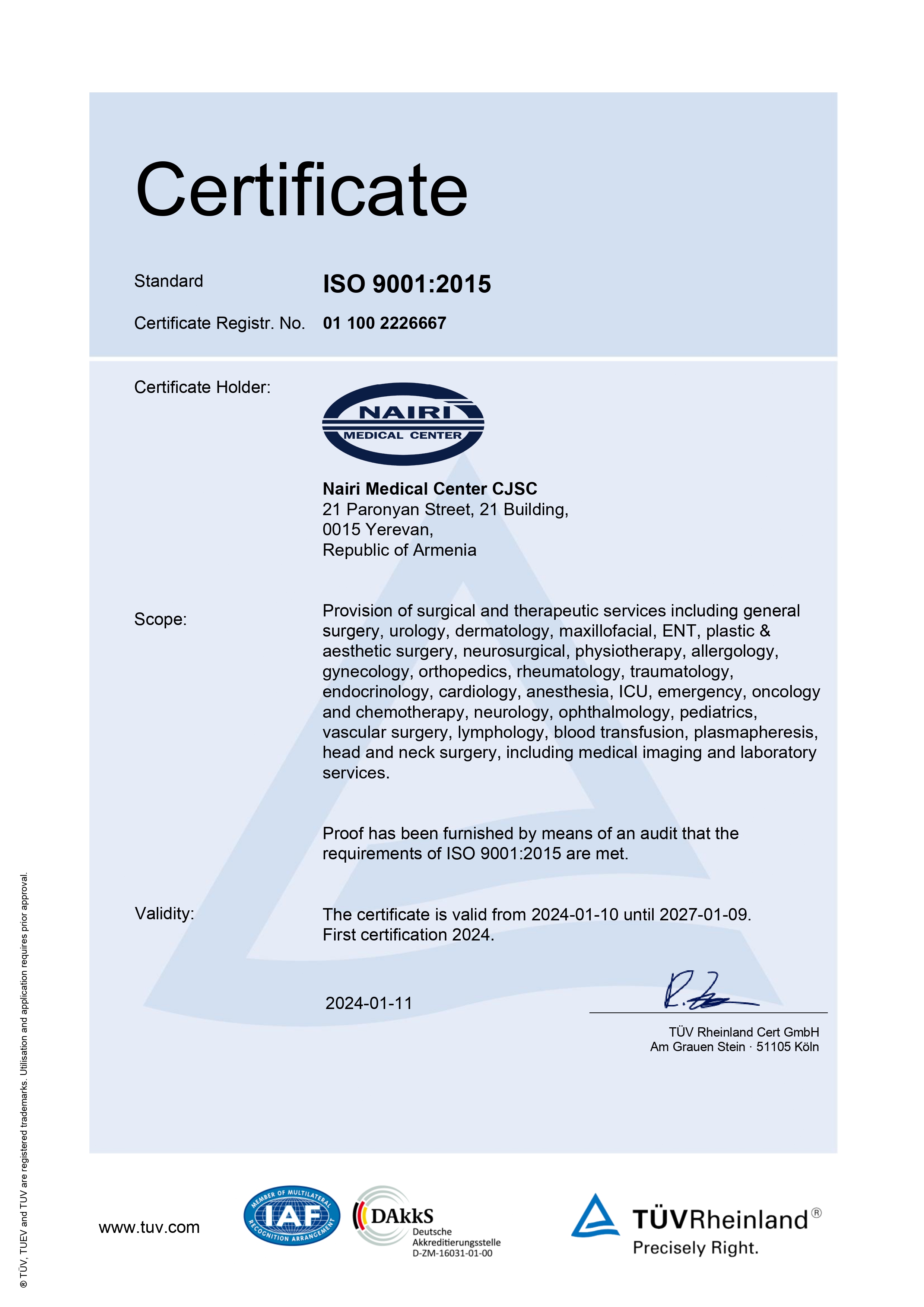 «Նաիրի» բժշկական կենտրոնը հաստատակամ է ապահովելու մատուցվող ծառայությունների բարձր որակը և պացիենտների գոհունակությունը։ Որակի կառավարման միջազգային ISO 9001:2015 ստանդարտի ներդրման և հեղինակավոր Joint Commission International (JCI) հավատարմագրման գործընթացի շրջանակներում՝ Մենեջմենթ Միքս ընկերության հետ համատեղ բուժհաստատությունը ներդրել է որակի կառավարման համակարգ։ Համակարգի համապատասխանությունը հաստատվել է TÜV Rheinland գերմանական կազմակերպության կողմից, որը հավատարմագրված է գերմանական հավատարմագրման մարմնի (DAkkS) կողմից, որն իր հերթին հանդիսանում է Միջազգային Հավատարմագրման Ֆորումի (IAF) անդամ։ Կազմակերպության միջազգային փորձագետների արտաքին աուդիտի արդյունքում բուժհաստատությունը ստացավ ISO 9001:2015 ստանդարտի համապատասխանության սերտիֆիկատ: