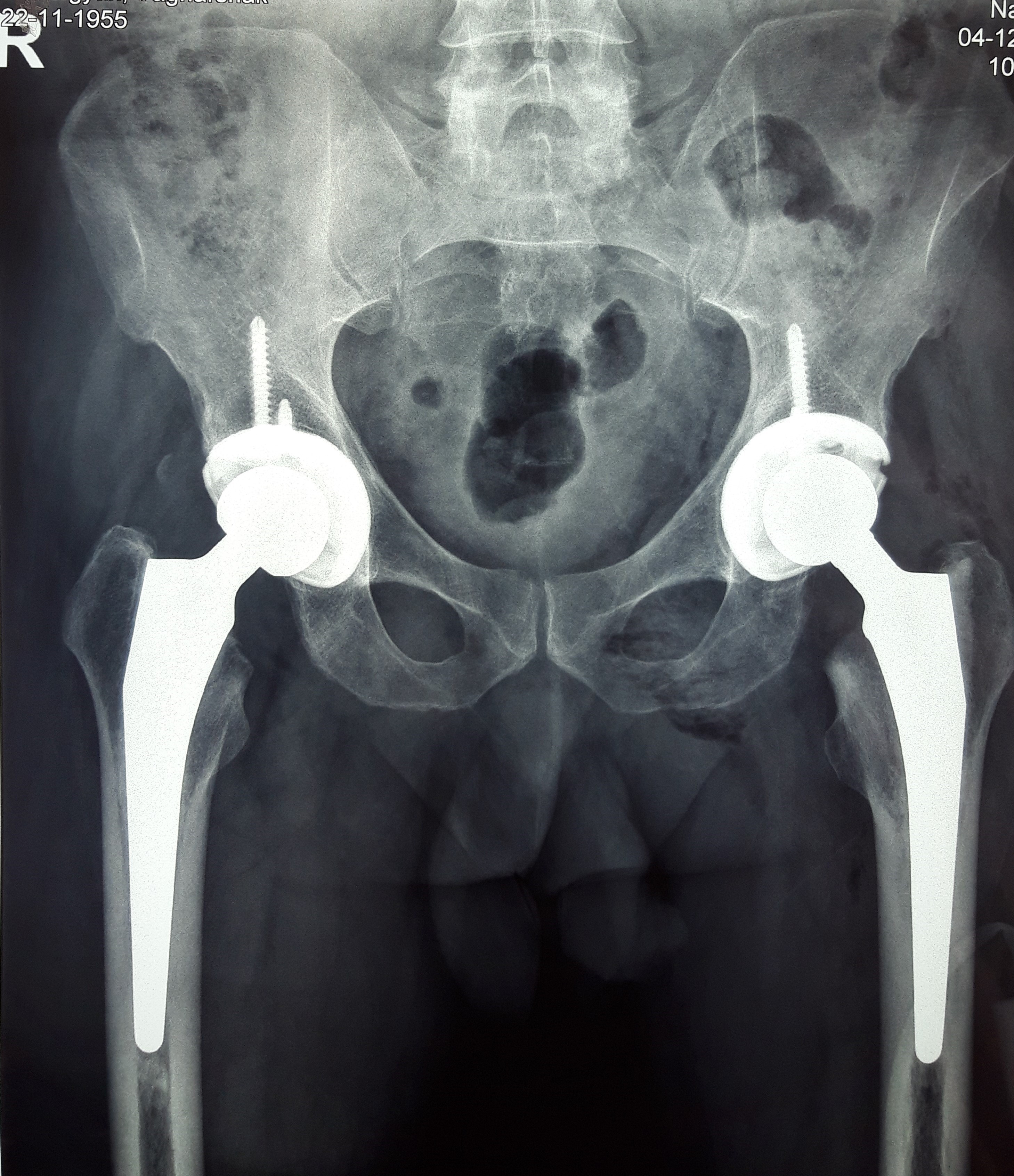 Պացիենտի մոտ առկա էր արտահայտված ցավային համախտանիշ: Վեց ամսվա տարբերությամբ կատարվեց զույգ հոդերի պրոթեզավորում: