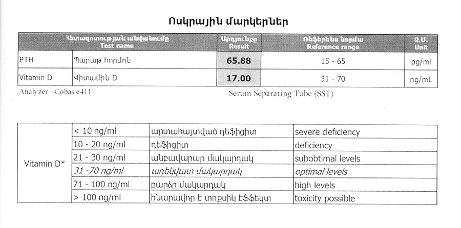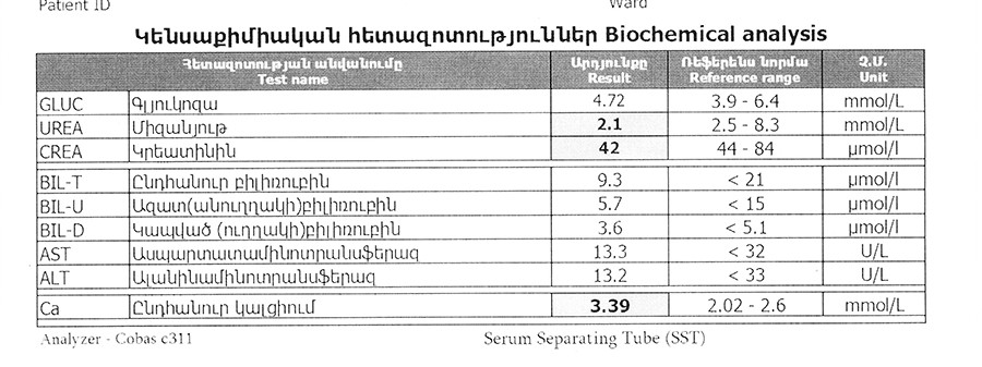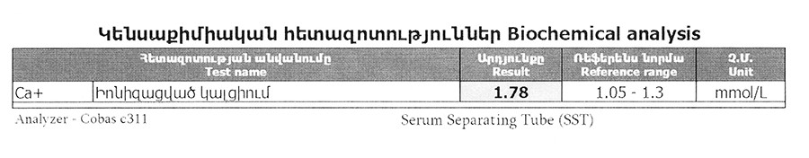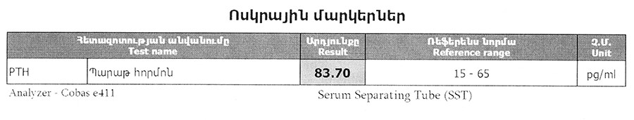 Վիրահատության հաջորդ օրը կալցիումն արյան մեջ նույնպես արդեն նորմայի սահմաններում էր, որը նախքան վիրահատությունը նույնպես շատ բարձր էր: Երկու շաբաթ անց կատարված հետազոտությունների արդյունքները նորմայի սահմաններում էին (պարաթհորմոնը, կալցիումը): Պացիենտը նշում էր ոսկրային ցավերի խիստ նվազում:
